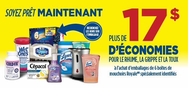 17$ en coupons rabais dans les emballages de 6 boîtes de mouchoirs Royale spécialement identifiés.