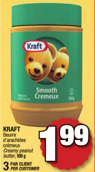 Du 23 au 29 janvier 2014, chez Jean Coutu, la beurre d’arachide Kraft est en spécial à 1,99$ avec le coupon rabais 1$ le produit reviens à 99¢ !