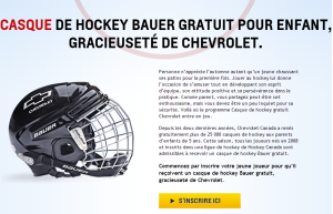 Depuis les deux dernières années, Chevrolet Canada a remis gratuitement plus de 25 000 casques de hockey aux parents d’enfants de 5 ans. Cette saison, tous les joueurs nés en 2008 et inscrits dans une ligue de hockey de Hockey Canada sont admissibles à recevoir un casque de hockey Bauer gratuit.