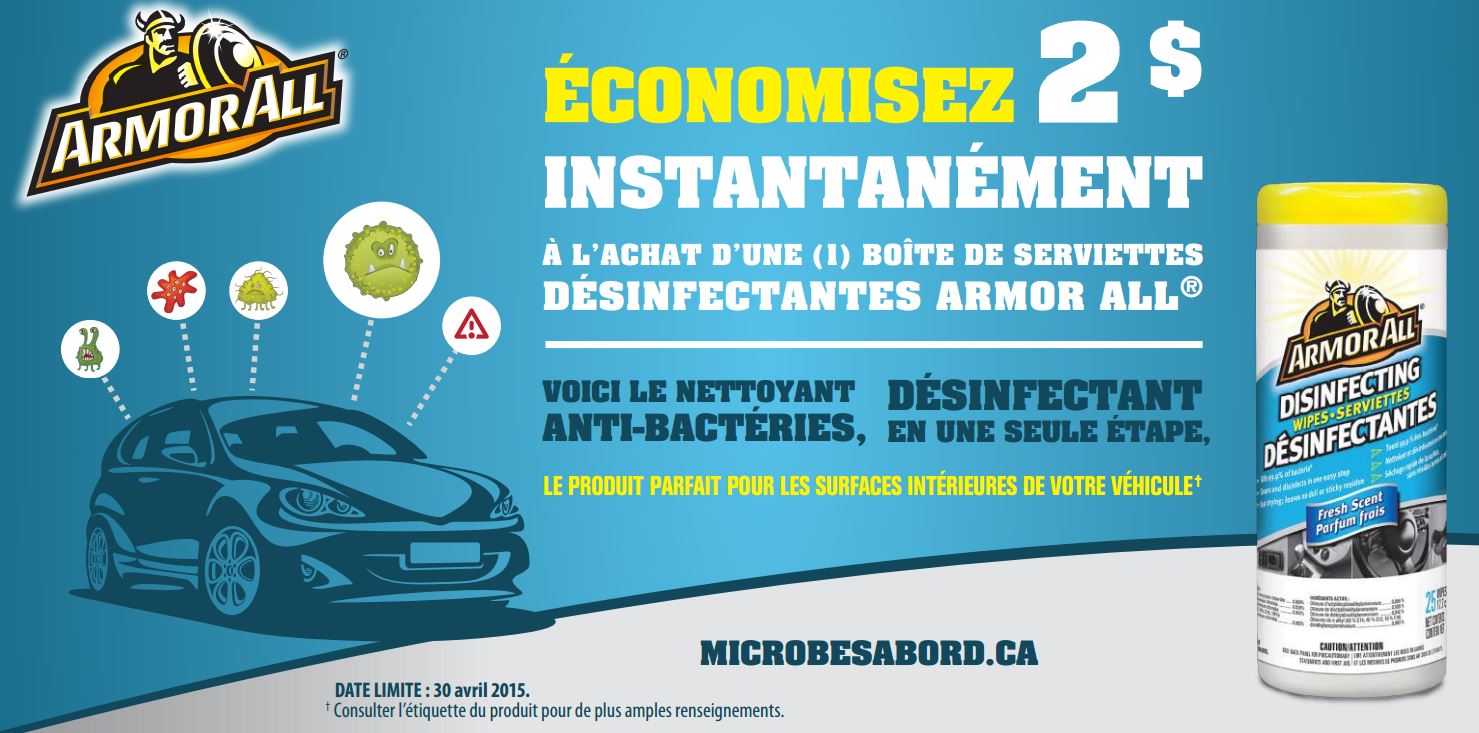 Imprimez le coupon rabais Armor All ici. Le coupon est valide jusqu’au 30 avril 2015