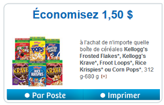 Coupon rabais de 1.50$ sur n’importe quelle boîte de céréales Kellogg’s Frosted Flakes, Kellogg’s Krave, Froot Loops, Rice Krispies ou Corn Pops, 312 g-680 g