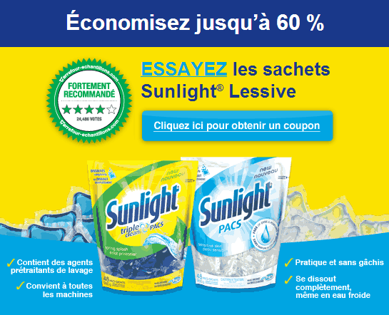 Membre de la voix de l’acheteur regarder vos courriels un nouveau coupon rabais de 8$ sur les sachets Sunlight pour la lessive.