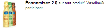 Du 2 au 8 novembre chez Pharmaprix. la lotion vaseline est en spécial à 2,99$ donc avec le coupon rabais à imprimer de 2$ le produit revient à 99¢ !