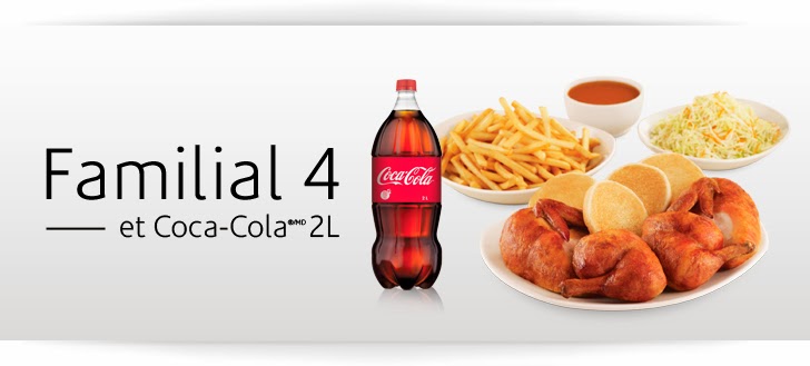 Pour un temps limité, gâtez vos proches avec le Familial 4 et recevez gratuitement une bouteille Coca-Cola 2L!* Pour 29,95$ à la livraison, le Familial 4 est composé de deux quarts de poulet cuisse et deux quarts de poulet poitrine, quatre accompagnements au choix, salade de chou et sauce Bar-B-Q en format familial, le tout accompagné d’une bouteille de Coca-Cola 2L.