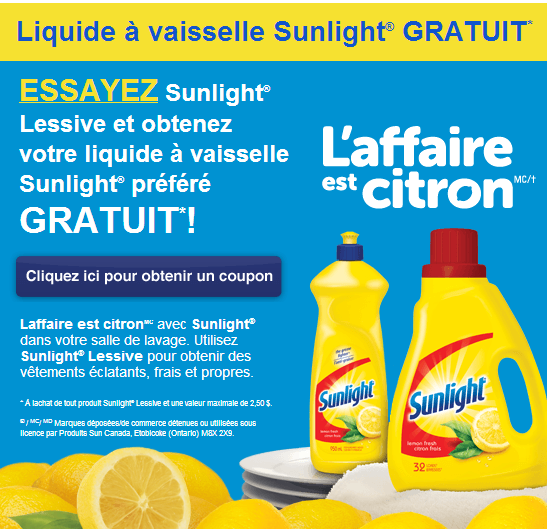 Membre de La Voix De L’acheteur un coupon rabais pour obtenir un savon à vaisselle Sunlight gratuit à l’achat de détergent à lessive Sunlight vous à été envoyé ! Regardez vos courriels !
